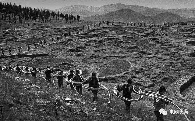 ?上世紀八十年代,我國山區電力施工架線,一根核桃粗細的輸電導線,需要幾十人乃至上百人用扁擔挑著上山進行施工放線。圖為1982年山東省淄博市博山區石門鄉龍堂山區架線現場。