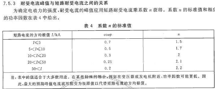 另外,峰值系數(shù)n按GB14048.1-2012《低壓開關(guān)設備和控制設備 第1部分:總則》和GB7251.1-2013《低壓成套開關(guān)設備和控制設備 第1部分:總則》給出的表格參數(shù)來取值。下圖為GF7251.1的參數(shù):