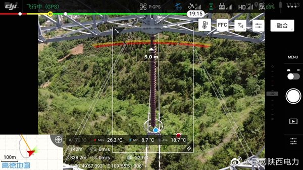 11月6日下午,國網重慶北碚供電公司建設部項目管理人員、輸電運檢室無人機作業班成員一行來到220kV思水東西線#42塔遷改現場,利用無人機進行導地線掛點狀態檢查。本次檢查旨在為即將進行的北碚水土嘉陵江大橋南引道220kV思水東西線#42塔遷改工程停電組塔、放線工作做準備,無人機作業班的飛手們在山腳下嫻熟地操作無人機,使其迅速升至離地近100米的高空,平穩的懸停在#42鐵塔上部,分別對思水東西線的OPGW光纜以及上、中、下三相導線的懸掛情況進行詳細檢查,通過高清攝像頭進行錄像、拍照,分析其懸掛情況及導線狀態,為確定詳細的斷線、放線方案提供重要依據。利用無人機技術進行鐵塔檢查,克服了以往采用望遠鏡、肉眼觀察的缺點,可以清晰、準確、安全、直觀、高效地完成輸電線路狀態檢查,為基建線路工程建設提供了強大的“千里眼”。