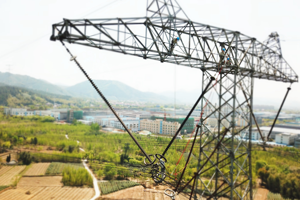 只見另外3名高空作業(yè)人員和4名地面人員通力配合,將進電場消缺作業(yè)的楊釗從桿塔頂部,如同“蕩秋千”一般緩緩靠近帶電導線,在距離導線0.5米時進入百萬伏電場。這個0.5米的距離,需要經(jīng)過前期圖紙校核計算,作業(yè)時在高空的人員精準設置滑車位置,地面人員細心控制繩索,確保楊釗能順利進入電場。