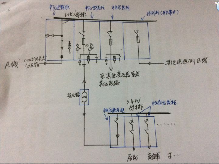 平時,電從A線電源處來,經過中壓進線柜,由各個中壓出線柜分配給各個變壓器。變壓器通過電壓轉換,電由低壓進線柜進入后,同理由各個低壓出線柜分配到各家各戶里。