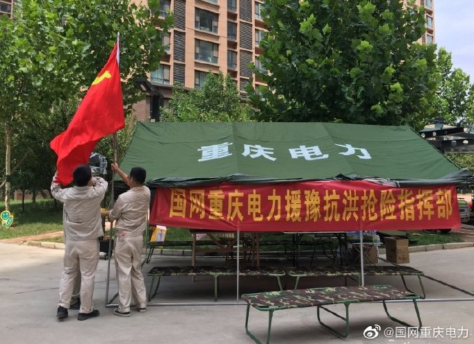 【搭起帳篷安營扎寨 他們說:不通電就不撤退】7月27日,完成鄭州濱河花園小區復電工作后,國網重慶援豫抗洪救災紅巖共產黨員服務隊來到河南大學明德園小區開展搶險保供電工作,他們搭起一頂頂帳篷安營扎寨,服務隊長范昭勇表示:“不通電,不撤退!” ????